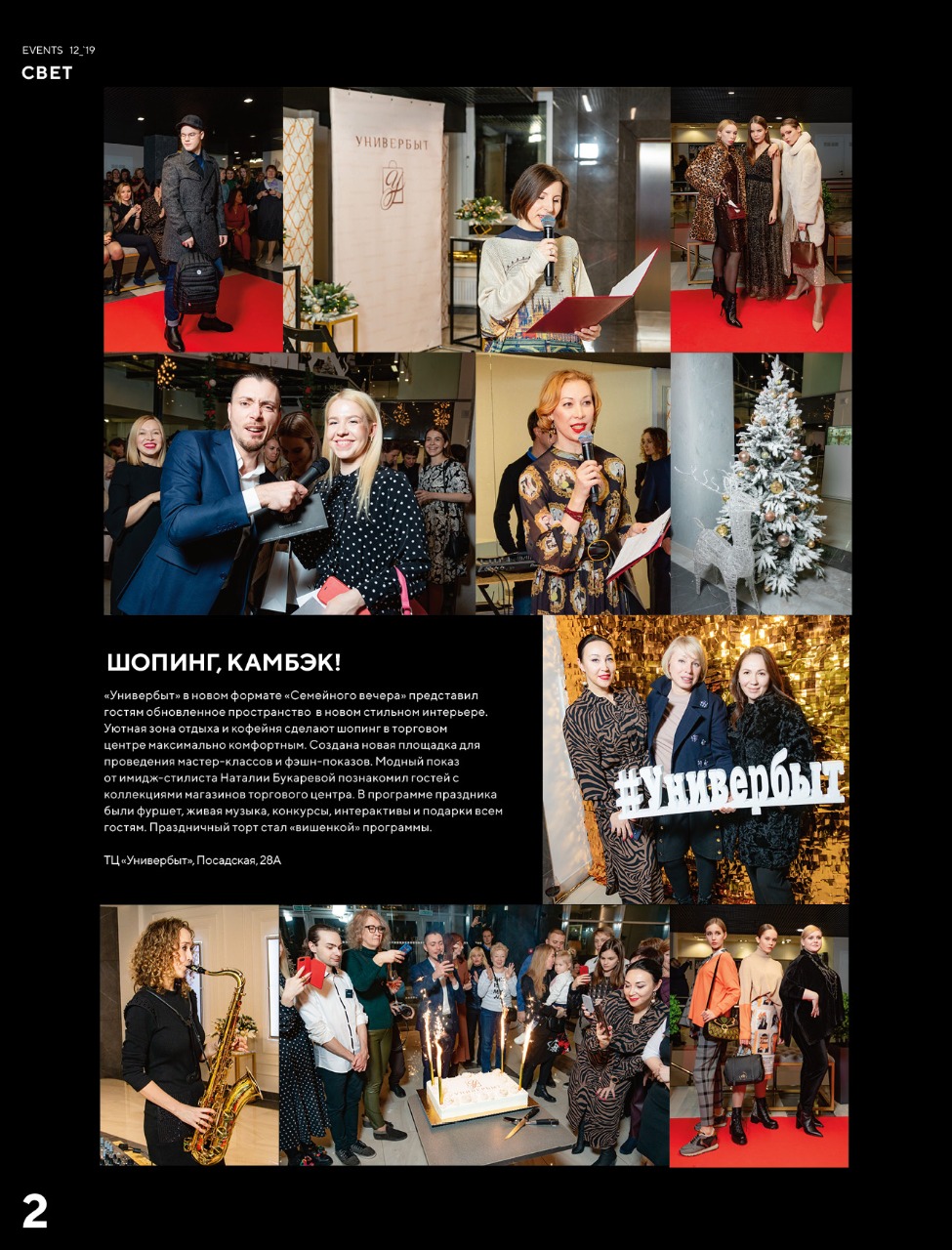Универбыт в новом формате "Семейного вечера" представил гостям обновлённое пространство в новом стильном интерьере. Уютная зона отдыха и кофейня сделают шопинг в торговом центре комфортным. Создана новая площадка для проведения мастер-классов и фэшн-показов. Модный показ от имидж-стилиста Наталии Букаревой познакомил гостей с коллекциями магазинов торгового центра. В программе праздника были фуршет, живая музыка, конкурсы, интерактивы и подарки всем гостям. Праздничный торт стал "вишенкой" программы.